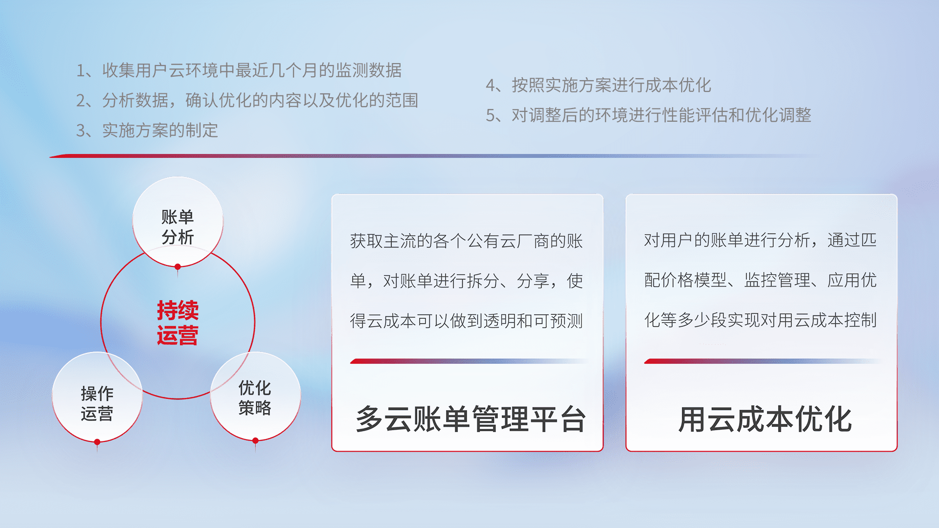 通过多云纳管,,,,以统一的资源数据模型把客户的云资源进行抽象和封装,,进而实现对多云资源的统一操作,,保障云资源管理的可靠性、、、、稳定性与可用性。。。量身定制化运维内容,,配置、、开发运维、、、、补丁管理、、、备份、、监控、、认证和访问管理、、、审计和日常巡检等,,,保障在用云过程中的可靠度,,稳定度以及高可用率。。。。