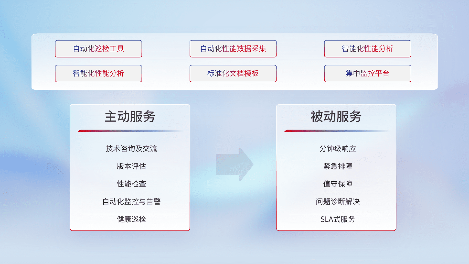 智能化工具和标准化文档,,,,保障服务质量,,提供主动服务(包含技术咨询、、版本评估、、、性能检查、、自动化监控与告警、、健康巡检)和被动服务包含(分钟级响应、、紧急排障、、值守保障、、、问题诊断解决、、SLA服务)。。